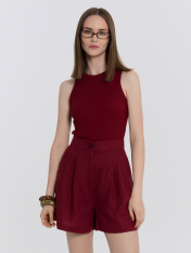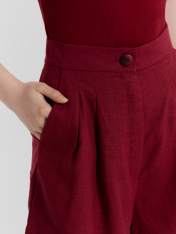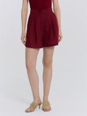 Шорты женские из ткани, с посадкой на линии талии. _x000D_ Верхний срез обработан отрезным поясом из основного полотна. Центральная застежка на молнию и пуговицу. Пуговица. На передних половинках обработаны косые карманы от пояса к боковым швам с отрезным бочком. По верхнему срезу заложены по две односторонние складки._x000D_ На задних половинках обработаны талевые вытачки._x000D_ Низ обработан швом вподгибку с закрытым срезом, с широкой подгибкой_x000D_ _x000D_ _x000D_