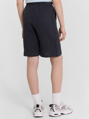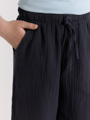 Шорты для мальчиков из ткани (муслин). Шорты с классической линией талии. Силуэт прямой. Пояс цельнокроеный. Верхний срез шорт застрочен с эластичной тесьмой. Карманы в боковых швах (хулиганы). На внешней стороне пояса пробиты петли, втянут шнур из основного полотна. Низ шорт обработан швом в подгибку.