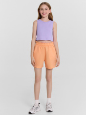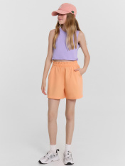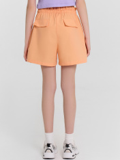 Шорты для девочек короткие. Пояс отрезной, с втаченной эластичной тесьмой RV30, образующей сборку. На задних деталях шорт клапаны имитирующие карман, с закрепкой посередине. Низ шорт обработан швом в подгибку.
