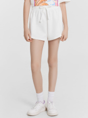 Шорты для девочек. Шорты укороченные, с высокой посадкой. Пояс цельнокроеный с эластичной тесьмой внутри. Снаружи пробиты петли и втянут шнур 8PXС-2. В боковых швах кант из трикотажного кулирного полотна. Нижние срезы шорт обработаны швом в подгибку.