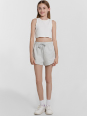 Шорты для девочек. Шорты укороченные, с высокой посадкой. Пояс цельнокроеный с эластичной тесьмой внутри. Снаружи пробиты петли и втянут шнур 8PXС-2. В боковых швах кант из трикотажного кулирного полотна. Нижние срезы шорт обработаны швом в подгибку.