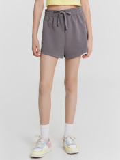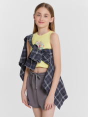 Шорты для девочек. Шорты укороченные, с высокой посадкой. Пояс цельнокроеный с эластичной тесьмой внутри. Снаружи пробиты петли и втянут шнур 8PXС-2. В боковых швах кант из трикотажного кулирного полотна. Нижние срезы шорт обработаны швом в подгибку.