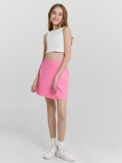 Шорты для девочек длиной до середины бедер с классической линией талии. Силуэт расширенный к низу. По переду отлетная деталь. Пояс цельнокроеный с эластичной тесьмой внутри 40RV. Низ изделия обработан швом в подгибку.