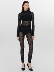 Леггинсы из лимитированной коллекции Mark Formelle x Ольга Бузова создают выразительный современный образ. Плотное облегание по всей длине и высокая линия талии визуально вытягивают силуэт и подчеркивают его стройность._x000D_ Отличительной особенностью модели является цельный пояс со встроенной широкой эластичной тесьмой. Такая конструкция обеспечивает надежную поддержку и комфорт, не сползая и не перекручиваясь в течение дня. Отсутствие боковых швов создает идеально гладкую поверхность, которая не натирает и обеспечивает безупречное прилегание. <br>_x000D_ <br>_x000D_ Фактура сетки добавляет образу дерзкую и игривую нотку, делая легинсы смелым акцентом. Состав на основе полиэстера с добавлением спандекса обеспечивает материалу прочность, эластичность и способность точно повторять контуры тела. <br>_x000D_ <br>_x000D_ Эти легинсы станут универсальной основой для создания многослойных образов, идеально сочетаясь с шортами, юбками, платьями или удлиненными свитшотами для прогулок и повседневной носки._x000D_