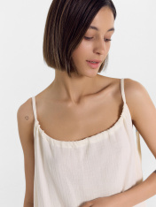 Воздушное и невероятно комфортное домашнее женское платье создано для отдыха и домашних дел. В составе изделия 100% хлопок. Мягкая муслиновая ткань отлично пропускает воздух, обеспечивая идеальную терморегуляцию. Горловина с кулиской, присборена. Тонкие бретельки обеспечивают надежную посадку, не доставляя дискомфорта. Простой, лаконичный дизайн без лишних деталей делает платье универсальным. Его можно носить и как уличный вариант. Благодаря свободному крою, платье делает фигуру изящнее и даритощущение легкости. Оно станет верным спутником в жаркие летние дни. Рекомендуем!