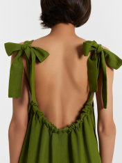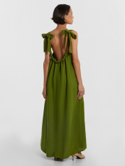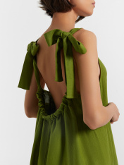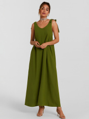 Сарафан женский А-силуэта из ткани. Горловина округлой формы, бретели широкие. Перед со средним швом. Спинка со средним швом, сверху присборена на кулиску. Бретели на спинке завязываются. Низ сарфана на широкой обтачке. Сарафан длиной миди.