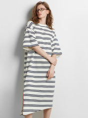 Платье женское свободного силуэта из трикотажного полотна кулирка. Горловина круглой формы, обтачка горловины из рибаны. Плечо спущено, пройма углублена. Рукав втачной, короткий, широкий, длиной по локоть. В правом боковом шве обработан разрез. Низ платья асимметричный. Длина миди.