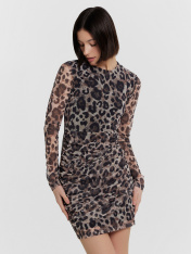 Это очаровательное женское платье — идеальный выбор для создания элегантного и женственного образа! Прилегающий силуэт и длина мини подчеркивают фигуру, делая модель стильной и изысканной. Горловина круглой формы, придающая платью классический и аккуратный вид. Длинные рукава из полупрозрачной сетки с принтом добавляют утонченности и легкости. Подкладка из кулирки обеспечивает комфорт и мягкость, что делает платье удобным в носке. Особой изюминкой модели является накладная деталь на нижней части, оформленная сборками по бокам. Это решение добавляет уникальности и динамики дизайну. Нижний срез платья и рукавов обработан швом вподгибку, что гарантирует аккуратный внешний вид и долговечность. Идеальное платье для особых случаев или вечерних прогулок, оно подарит вам ощущение уверенности и элегантности!