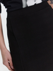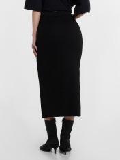 Юбка женская прилегающего силуэта из трикотажного полотна рибана. Юбка с отрезным поясом из основного полотна с эластичной тесьмой внутри. На детали переда шов с обработаным разрезом. Длина юбки ниже колена. Низ юбки сырой срез с проложеной строчкойпо краю.