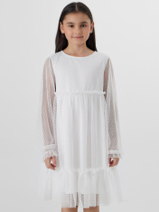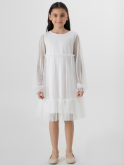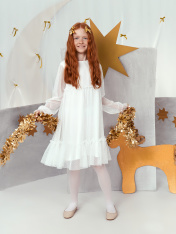 Нарядное платье для девочки из нежной сеточки – идеальный выбор для праздничных мероприятий, утренников и других торжественных случаев. Круглый вырез горловины и длинные рукава придают модели элегантность и утонченность. На спинке находится застежка-пуговица, что добавляет изысканный акцент. Подкладка платья выполнена из нежной хлопковой кулирки, которая обеспечивает комфорт и мягкость на протяжении всего дня. Кулирка – это материал, который дышит, позволяет коже ощущать приятную прохладу и предотвращает раздражение, что особенно важно для детской кожи. Это платье не только красиво, но и функционально, оно подарит вашей малышке ощущение праздника и комфорта. Рекомендуем для создания волшебного и нарядного образа!_x000D_ _x000D_ _x000D_ _x000D_ _x000D_