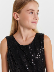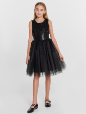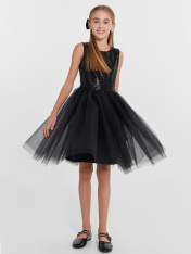 Платье полуприлегающего силуэта с отрезной пышной трехслойной юбкой._x000D_ Длина выше колена. Горловина по переду круглая, а по спинке с V-образным вырезом. Лиф изделия выполнен из полотна трикотажного сетки с пайетками, подкладка из полотна трикотажногокулирного. По спинке застежка на потайную молнию. Юбка трехслойная на сборке. Верхние два слоя из полотна трикотажного сетки, подкладка из полотна трикотажного кулирного. Низ подкладки обработан на 2х игольной плоскошовной машине. Первый слой сеткиюбки короче второго. _x000D_ _x000D_