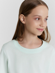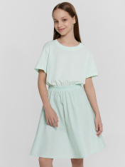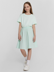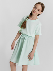 Платье для девочек полуприлегающего силуэта. Верх платья из трикотажного кулирного полотна .Горловина круглая окантована обтачкой из рибаны. Рукав, втачной короткий._x000D_ Платье отрезное по талии и присборено на резинки 30RV, низ платья из паплина._x000D_ Длинна ниже колена._x000D_