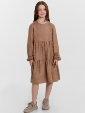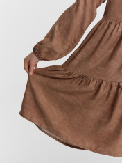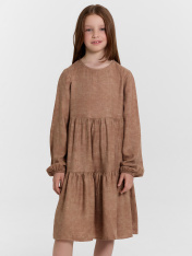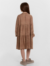Платье А-силуэта с отрезными воланами. Горловина круглая обработана бейкой в чистый край. На спинкке по горловине разрез, обработаный обтачкой, с пуговицей 10мм и петлей из жилки вязаной 4мм (13797K, KT1-4). Рукав длинный втачной. По низу рукавов внутрь застрочена эластичная тесьма 8RV.