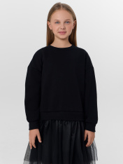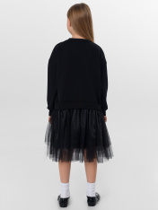 Платье для девочек свободного силуэта. Рукава втачные длинные, с отрезными манжетами из рибаны. Плечо слегка спущено. Горловина округлый формы с обтачкой из рибаны. Низ изделия обработан рибаной .