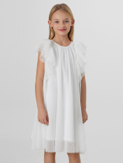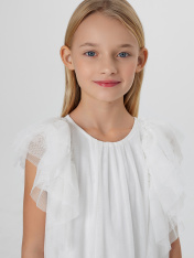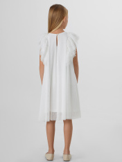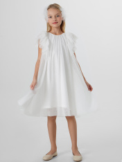 Платье А-силуэта. Спинка и перед цельнокройные. Вырез горловины круглый. По спинке застежка-капелька на одну петлю WT4-6 и пуговицу d=10mm. Вдоль верхней части проймы рукава расположено три слоя рюш, которые переходят с переда на спинку. Подкладка из трикотажного кулирного полотна.