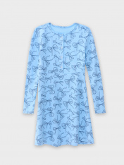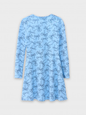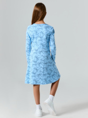 Платье полуприлегающего силуэта. С отрезной юбкой выше талии. Рукава втачные длинные. Горловина круглая, окантована бейкой из основного полотна. По переду застежка на пуговицы (d= 10 mm.) Низ изделия и рукавов обработан на 2-х игольной плоскошовной машине швом в подгибку.