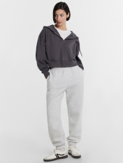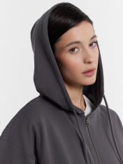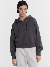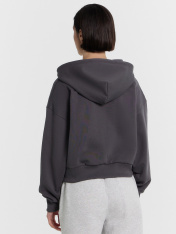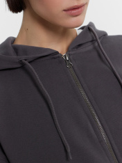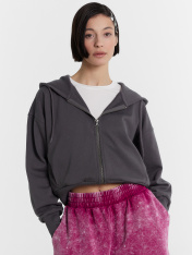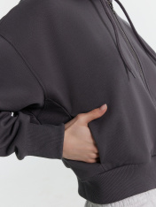 Укороченная женская толстовка – стильный и удобный выбор для вашего гардероба. Капюшон на кулиске обеспечивает защиту от ветра, а центральная застежка на молнию позволяет легко надевать и снимать изделие. Длинные рукава с эластичными манжетами из рибаны удерживают тепло и обеспечивают комфорт, в то время как спущенная линия плеча придает стильный и расслабленный вид. Боковые карманы добавляют функциональности, позволяя хранить мелкие вещи. Выполненная из футера без подчеса, толстовка отличаетсямягкостью и долговечностью, обеспечивая комфорт при носке. Она идеально подойдет для создания повседневных и спортивных образов, легко сочетаясь с различными элементами гардероба.