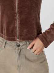Толстовка полуприлегающего силуэта, укороченная. Горловина круглой формы с капюшоном. Капюшон со средним швом, на подкладке из кулирки. Шов втачивания капюшона и притачивания молнии закрыт тесьмой хб. Центральная застежка на тесьму-молнию. Рукава втачные длинные._x000D_ Нижние срезы толстовки и рукавов обработаны швом вподгибку._x000D_