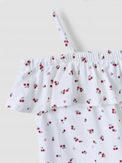 Сарафан А-силуэта на тонких бретелях. По плечевому поясу расположен декоративный волан со сборкой по верхнему срезу на эластичную тесьму. Низ изделия и низ волана обработаны на 2-х игольной плоскошовной машине швом в подгибку.