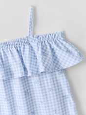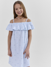 Сарафан А-силуэта на тонких бретелях. По плечевому поясу расположен декоративный волан со сборкой по верхнему срезу на эластичную тесьму. Низ изделия и низ волана обработаны на 2-х игольной плоскошовной машине швом в подгибку.