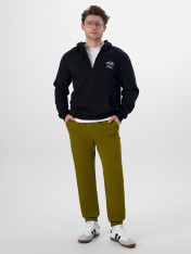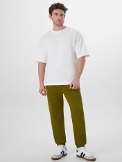 Джогеры прямые, зауженные к низу. Пояс отрезной с эластичной тесьмой внутри. С внутренней стороны пояса пробиты петли и втянут шнур с эглетами (8EКXWCp-1). В боковых швах обработаны карманы - хулиганы, подкладка карман из кулирки. На задней правой половинке накладной карман, по заданию. Нижние срезы брюк обработаны швом вподгибку с эластичной тесьмой внутри._x000D_