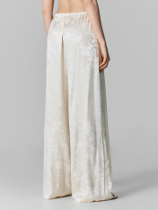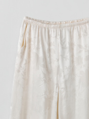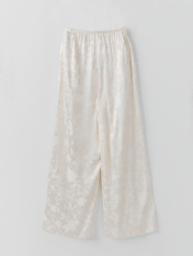 Брюки прямые свободные, посадка средняя. Пояс цельнокроеный с эластичной тесьмой внутри (20мм 20RV). С внутренней стороны пояса пробиты петли и втянут шнур-бейка из основного полотна. На деталях переда обработаны карманы-хулиганы. Подкладка карман из основного полотна. На правой детали переда имитация гульфика. Нижние срезы обработаны швом вподгибку с закрытым срезом.