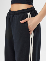 Женские брюки прямого кроя со стильными лампасами — элегантное решение для повседневного гардероба. Модель из мягкого интерлока сохраняет форму и обеспечивает комфорт в течение всего дня._x000D_ Вертикальные контрастные лампасы визуально вытягивают силуэти добавляют образу динамики. Средняя посадка и эластичный пояс со шнуром позволяют регулировать посадку по фигуре, а боковые карманы с нежной подкладкой заботятся о вашем удобстве.<br>_x000D_ <br>_x000D_ Сбалансированный состав из хлопка и полиэстера создает идеальный дуэт практичности и комфорта: натуральные волокна обеспечивают воздухообмен, а полиэстер повышает износостойкость и сохраняет форму. Плотный материал обладает высокой прочностью и приятен к телу. Универсальный оттенок легко сочетается с разными верхами — от трикотажных блузок до объемных свитеров. Идеальный выбор для офиса, прогулок или отдыха._x000D_