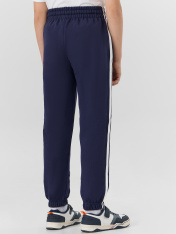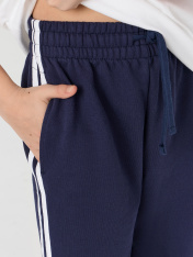 Пояс отрезной с эластичной тесьмой внутри 50RV. По переду пробиты петли и втянут шнур 10 PX-1 с застроченными концами. На деталях переда карманы в швах. Подкладка карманов из кулирки. _x000D_ Нижние срезы обработаны в подгибку с эластичной тесьмой внутри 30RV. По бокам настрочены лампасы._x000D_