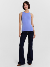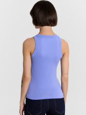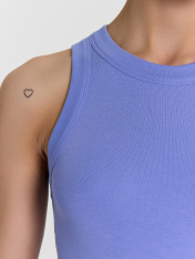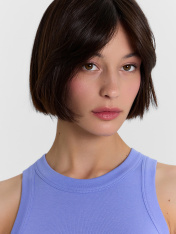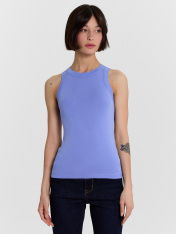 Топ женский из рибаны._x000D_ Узкое плечо, углубленная пройма._x000D_ Силуэт облегающий, длиной ниже уровня талии._x000D_ Перед и спинка цельнокроеные._x000D_ Горловина круглая, плотно прилегающая к шее._x000D_ Горловина и проймы окантованы широкой бейкой из основного полотна._x000D_ Низ изделия обработан швом вподгибку на плоскошовной машине.