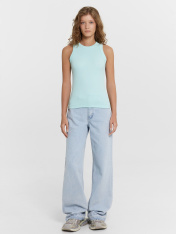 Топ женский из рибаны._x000D_ Узкое плечо, углубленная пройма._x000D_ Силуэт облегающий, длиной ниже уровня талии._x000D_ Перед и спинка цельнокроеные._x000D_ Горловина круглая, плотно прилегающая к шее._x000D_ Горловина и проймы окантованы широкой бейкой из основного полотна._x000D_ Низ изделия обработан швом вподгибку на плоскошовной машине.