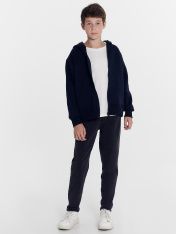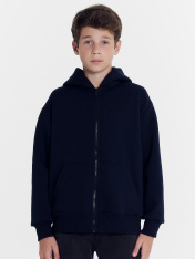 Жакет для мальчиков прямого силуэта с капюшоном. Капюшон на подкладке из основного полотна. Шов втачивания капюшона закрыт х/б тесьмой. Рукава втачные, линия плеча спущена. Притачные манжеты по низу рукавов и притачной пояс из рибаны. По переду застежка молния, карман кенгуру.