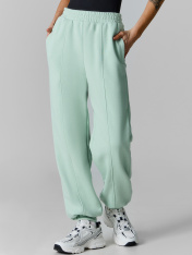 Брюки женские из трикотажного полотна футер._x000D_ Силуэт свободный. Карманы в боковых швах, подкладка карманов из кулирного полотна._x000D_ Пояс отрезной из основного полотна, внутри эластичная тесьма 50RV. По поясу проложены отделочные строчки._x000D_ По переду, вдоль отрезной фигурной детали, проложены отделочные строчки._x000D_ Низ брюк с отрезной манжетой из рибаны._x000D_