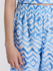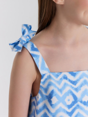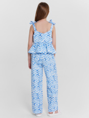 Блуза для девочек на бретелях, полуприлегающего силуэта. Бретели завязываются на бантик. По линии лифа отрезная деталь Брюки с посадкой на талии прямого силуэта. Пояс отрезной с резиной внутри 40RV. Низ изделия застрочен швом в подгибку.