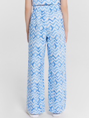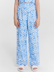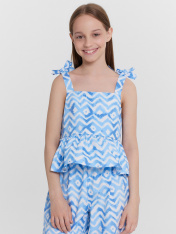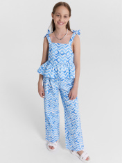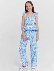 Блуза для девочек на бретелях, полуприлегающего силуэта. Бретели завязываются на бантик. По линии лифа отрезная деталь Брюки с посадкой на талии прямого силуэта. Пояс отрезной с резиной внутри 40RV. Низ изделия застрочен швом в подгибку.