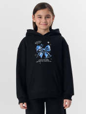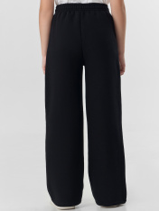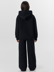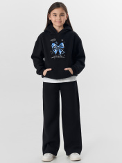 Худи для девочек, свободного силуэта (оверсайз), с капюшоном. Горловина округлой формы. Капюшон со средним швом, на подкладке из основного полотна. Шов втачивания капюшона закрыт хб тесьмой. Плечо спущено, рукав втачной длинный. По низу рукава отрезная манжета из рибаны. Пояс отрезной из рибаны, отстрочен. По переду карман кенгуру. Брюки для девочек, прямого силуэта. Пояс цельнокроеный с втачной эластичной тесьмой RV40. Пояс прострочен двумя отделочными строчками. По переду обработаны карманы в швах. Низ брюк обработан швом в подгибку на двухигольной плоскошовной машине.