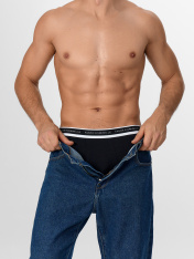 Трусы мужские из трикотажного полотна кулирного._x000D_ Прилегающие, без боковых швов. Планка с вытачкой. Задний шов ластовицы обработан строчкой «флэт-лок». По верхнему срезу настрочена фирменная жаккардовая эластичная тесьма (30 мм или 35 мм, по заданию) на 3-хигольной плоскошовной машине. Боковой срез тесьмы стачен строчкой «флэт-лок». Нижние срезы застрочены швом вподгику на плоскошовной машине.
