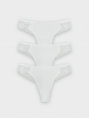 Кокетливые трусики-стринги, которые станут изысканным дополнением вашего гардероба. Они выполнены из натурального хлопка и нежного кружева, что обеспечивает мягкость и дышащие свойства. Натуральный хлопок позволяет коже дышать, предотвращая раздражение и обеспечивая комфорт на протяжении всего дня. Линия талии заниженная, что придает трусикам стильный и современный вид. Универсальная базовая расцветка делает их идеальным выбором для любого случая, сочетая в себе элегантность и удобство. Кто сказал, что красивое не может быть комфортным? Эти трусики-стринги доказательство того, что можно сочетать изысканный дизайн и комфортное ношение! В наборе: 3 шт.