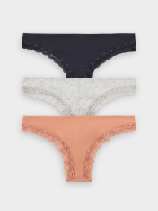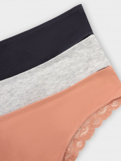 Стильный набор женских трусиков бразилиана (3 шт.) разных цветов из высококачественного хлопка с кружевными деталями. Невероятно удобные, благодаря своей невысокой посадке, они пользуются заслуженной любовью покупательниц. Изготовлены из натурального материала, дышащего, мягкого, гипоаллергенного - идеального для повседневной носки. Продуманная анатомичная конструкция, плоские швы и деликатные резиночки делают эту модель подходящей для занятий спортом, можно использовать её как спортивное бельё, а также, оно идеально для ежедневной носки. Пригодятся трусы бразилиана и будущим мамам: талия трусиков удобно помещается под растущим животиком и абсолютно не давит. Отлично тянутся, хорошо пропускают воздух и не создают парникового эффекта. Размерный ряд широкий, красивые базовые цвета и модели с принтами - никого не оставят равнодушными. Милый дизайн радует глаз, а дополнить такие трусики легко шикарным верхом из линейки нижнего женского белья. Порадуйте себя и близких красивым женским бельем на праздники и просто без повода!