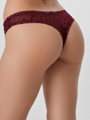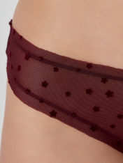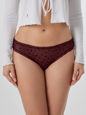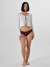 Трусы женские, средняя линия талии, силуэт - бразилиано. Передняя и задние детали выполнены из сетки. Подкладка ластовицы из хлопка, верхний срез подкладки ластовицы отлетной. По верхнему срезу трусов и по ножкам рюша из сборки, под низом жилка.
