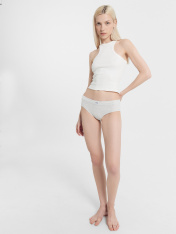 Трусы женские, средняя линия талии, силуэт - слипы. Передняя и задняя детали выполнены из рибаны. Верхний срез трусов обработан бейкой поперечной из рибаны, внутри жилка 6мм. Нижние срезы обработаны бейками поперечными из рибаны. Подкладка ластовицы из хлопка, отлетная по верхнему срезу.