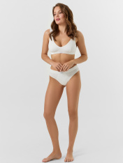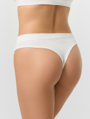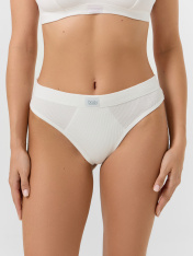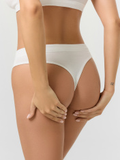 Трусы женские, средняя линия талии, силуэт - бразилиано. Передняя и задняя детали выполнены из рибаны. Верхний срез трусов обработан бейкой поперечной из рибаны, внутри жилка 6мм. Нижние срезы обработаны бейками поперечными из рибаны. Подкладка ластовицы из хлопка, верхний срез ластовицы притачан к детали из рибаны (с изнаночной стороны имитация мужского гульфика, с лицевой стороны декоративные строчки).