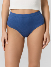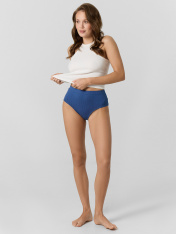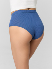 русы женские, высокая линия талии, силуэт-макси. Передняя и задняя детали выполнены из вискозной рибаны. Ластовица из кулирной глади отлетная по переднему срезу. Талия обработана швом вподгибку с жаккардовой тесьмой 25 мм внутри. Ножки обработаны притачной узкой бейкой из основного полотна.
