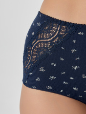 Женские трусы макси — воплощение элегантности и комфорта! Выполненные из высококачественного хлопка, они дарят мягкость, гипоаллергенность и полный комфорт при носке. Особенностью модели является изысканный декор: кружево, которое плавно переходит спередней детали на заднюю, создавая утонченный и гармоничный образ. Отсутствие боковых швов обеспечивает абсолютное удобство, а задняя деталь из рибаны гарантирует долговечность и комфортное прилегание. Высокая посадка, широкие боковые части и полностью закрытые ягодицы идеально адаптируются к фигуре, подчеркивая её формы и создавая уверенность в любой ситуации. Полупрозрачные кружевные вставки добавляют изделию женственности и изящества. Эти трусики прекрасно подходят дамам с пышными формами истановятся идеальным решением для повседневного гардероба. Эстетика и удобство в одном изделии!