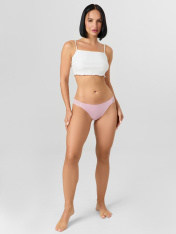 Трусы женские бесшовные — это идеальное сочетание комфорта и незаметности под одеждой. Модель силуэта-слипы с средней линией талии мягко облегает фигуру, не создавая давления. Передняя и задняя детали выполнены из мягкого интерлока, который обеспечивает гладкость и нежность прикосновения к коже._x000D_ Боковые стороны трусов оформлены декоративной эластичной тесьмой, которая заменяет традиционные швы — это исключает натирание и делает модель невидимой даже под обтягивающей одеждой._x000D_ Бесшовная технология и качественные материалы делают эти трусы универсальными для повседневной носки, спорта или особых случаев. Они сохраняют форму и цвет после множества стирок, не растягиваясь и не теряя мягкости. Нежный розовый оттенок добавляет образу женственности, а практичность кроя обеспечивает уверенность в любой ситуации.