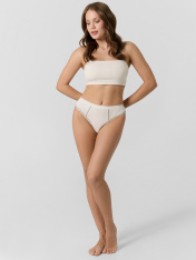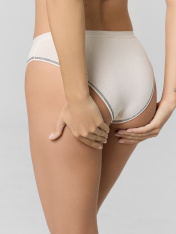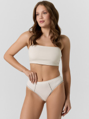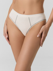 Трусы женские со средней линией талии силуэта «слип» из трикотажного полотна рибана. Передняя деталь с рельефами, по которым проложены декоративные строчки. Ластовица из кулирной глади отлетная по переднему срезу._x000D_ Задняя деталь цельная._x000D_ По талии эластичная тесьма._x000D_ Ножки окантованы бейкой из рибаны с эластичной тесьмой внутри, с отделочными строчками с верхним застилом.