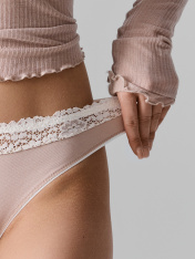 Трусы женские со средней посадкой, силуэт - бразилиана, выполнены из кулирного хлопкового полотна и эластичного кружева (арт. 4EG953, Femina, 85% полиамид; 15% эластан, 22,4 см, L138-22.4). Верхняя передняя деталь из эластичного кружева, нижняя деталь переда - из кулирного хлопкового полотна. Верхний и нижние срезы обработаны эластичной тесьмой 8 мм (с зубом KTE7-8, E7116 Arteks)._x000D_ Подкладка ластовицы из кулирного хлопкового полотна отлетная по переднему краю. _x000D_ По центру изделия спереди - По заданию 2 пуговицы (10-11мм) _x000D_