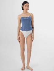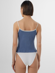 Топ женский из рибаны, силуэт прилегающий. Верхний край переда и спинки обработан кружевом 1,5 см (код L56-1,5 см, артикул L20166). Бретели из основного полотна, внутри жилка 6 мм (WT4-6, девсель 13460W). Нижний срез обработан швом вподгибку. _x000D_ Бантик по заданию.