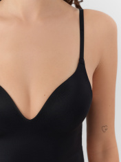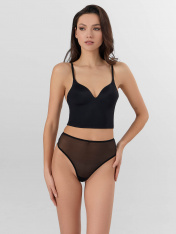 Топ женский из микрофибры, с чашками _x000D_ Перед и спинка цельные. Перед подформован на чашку. Срезы горловины и проймы по переду обтачные. Чашки с изнаночной стороны соединены между собой, по нижнему срезу чашек настрочена эластичная тесьма 10 мм (жесткая б/зуба WTWE1-10, девсел 487W). _x000D_ Спинка по верхнему срезу обтачана подкладкой из эластичной сетки. Сетка по боковым срезам соединена с чашками._x000D_ Бретель с регулировкой по длине 10 мм (SWE2-10) и 15 мм (SWE2-15) по размерам. По спинке бретель съемная. Регуляторы и крючки 10 и 15 мм по размерам металлические.