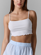 Стильный топ на тонких бретелях — прекрасный вариант для летнего гардероба. Благодаря хлопковой трикотажной рибане в рубчик он мягко прилегает к телу, создавая комфортное ощущение и подчеркивая силуэт. Особенность модели — закрученный нижний срез, который добавляет динамичный акцент и делает дизайн оригинальным. Такой крой придает изделию стильный и непринужденный вид, идеально подходящий для летних образов. Этот топ легко комбинируется с джинсами, юбками, шортами или льняными брюками, позволяясоздавать стильные повседневные или вечерние наряды. Легкий, удобный и актуальный — отличный выбор для теплого времени года!