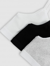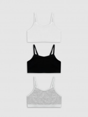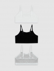 Хлопковое бюстье прилегающего силуэта для девочек. Выполнено из легкой и приятной к телу трикотажной рибаны. Вырез горловины и проймы окантованы эластичной тесьмой. На бретелях есть кольца-регуляторы. По нижнему краю бюстье расположена удобная и стильная жаккардовая тесьма. Идеально!